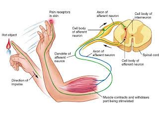 For example when a person accidentally touches a hot object, they automatically jerk their hand away without thinking. The brain receives the sensory input while the reflex is being carried out and the analysis of the signal takes place after the reflex action. A reflex does not require any thought input.